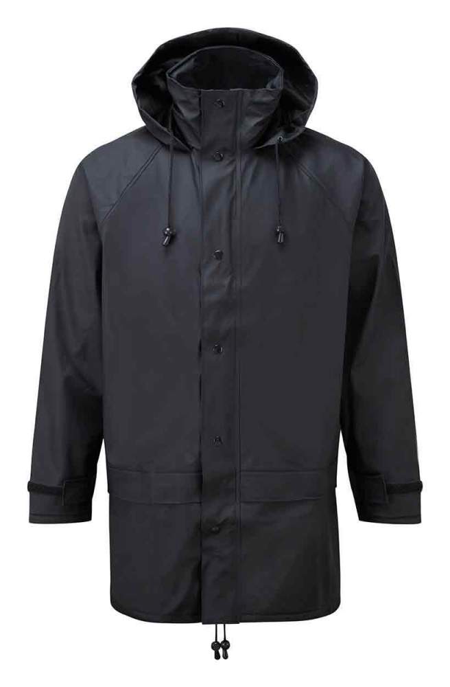 Waterproof stretchable PU tricot fabricZip front with studded storm flapConcealed hoodLarge pockets with VelcroAdjustable cuffs with VelcroWelded seams, fabric: Pu Tricot Fabric